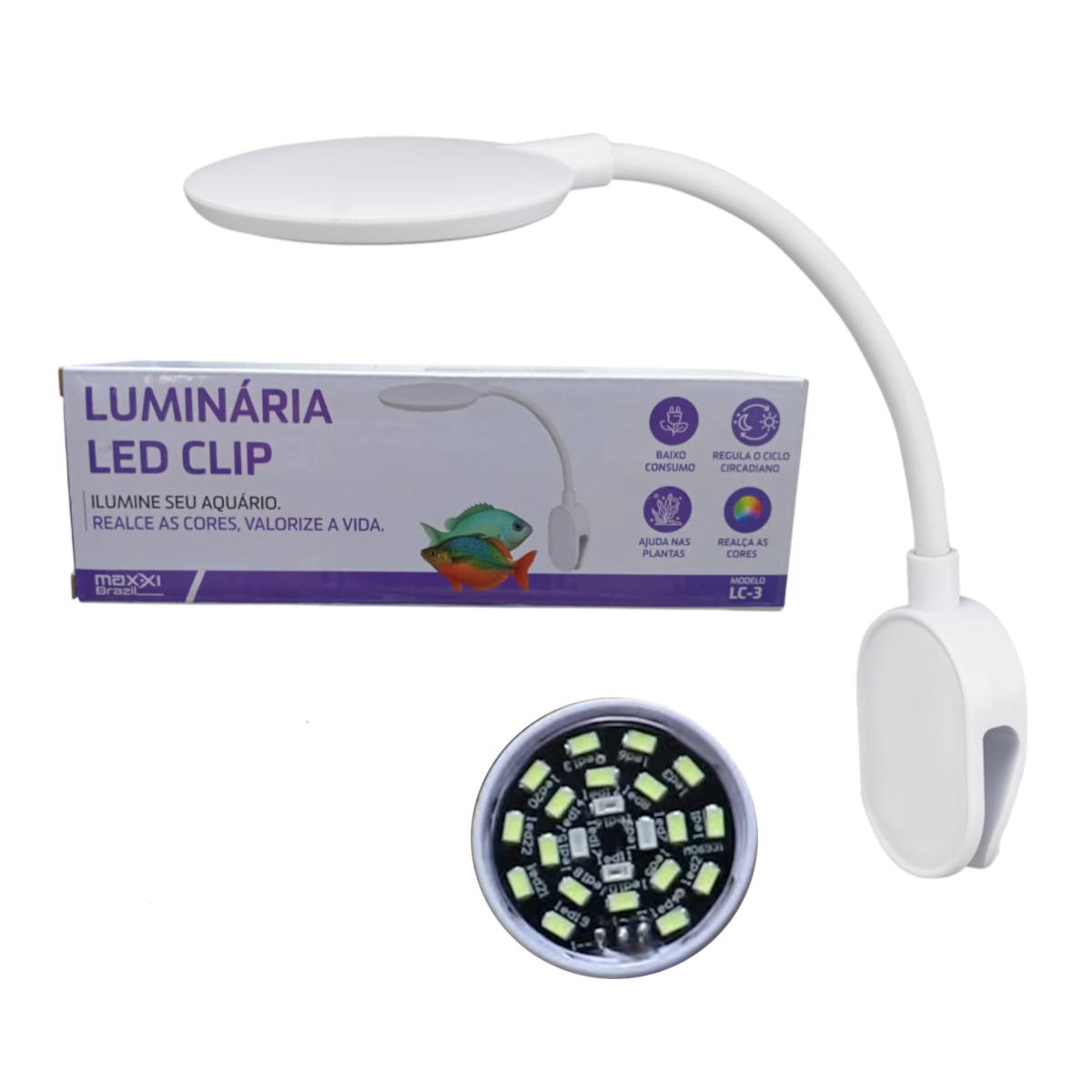 Luminária LED para aquários de água doce ou salgada de até 30cm. O equipamento fornece uma iluminação composta por LEDs brancos, vermelhos e azuis, que podem ser ligados em diferentes combinações ao acionar o botão liga/desliga.