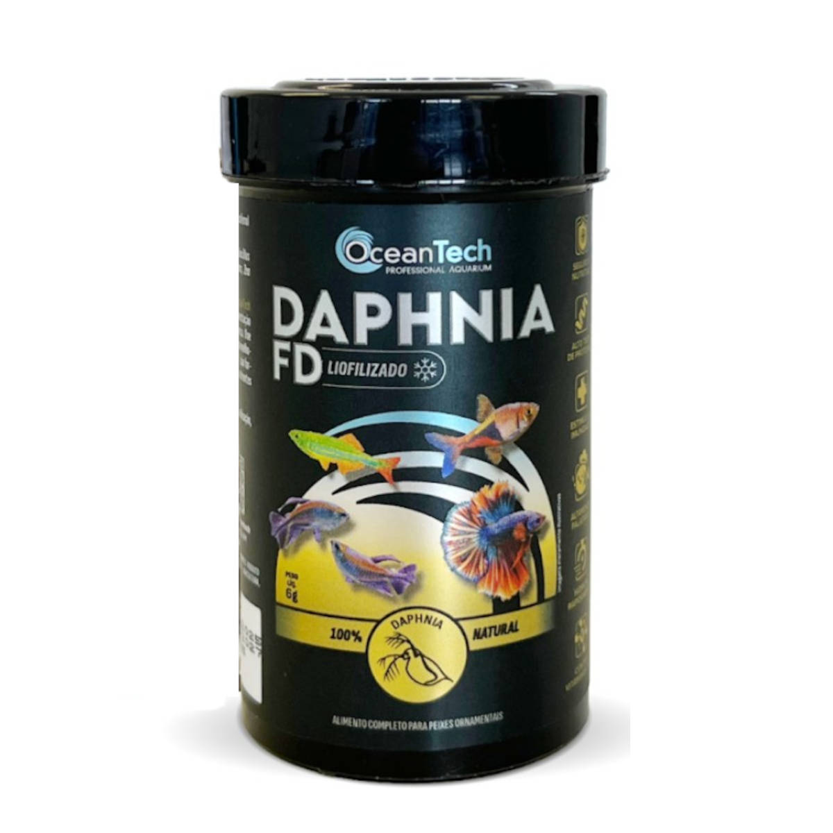 Ocean Tech Daphnia FD é um alimento liofilizado específico à base de dáfnias, que pode ser utilizado como complemento nutricional à dieta de peixes ornamentais. Um alimento altamente palatável, fonte de proteína e perfil lipídico equilibrado, que auxilia para uma dieta variada, nutritiva e energética. O produto oferece praticidade, sendo um complemento perfeito para a alimentação, fornecendo nutrientes essenciais para as fases de crescimento, desenvolvimento e reprodução. Este petisco proteico natural tem alta palatabilidade, auxilia no estímulo do comportamento natural de caça e forrageamento, importante no enriquecimento ambiental que atrai até espécies mais seletivas.