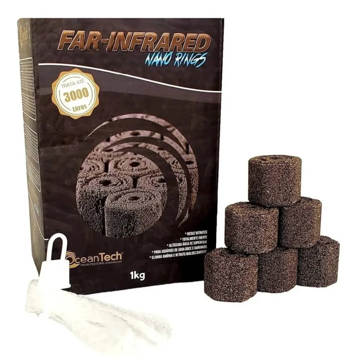 Ocean Tech Nano Rings Far-Infrared é produzido a partir de microesferas cerâmicas tridimensionais tendo assim uma área de superfície para a colonização de bactérias de até 10 vezes maior do que outras mídias filtrantes. Far-Infrared Nano Rings tem adição de elementos que emitem pequenas quantidades de raio infravermelho. O infravermelho é usado para o tecido celular, de modo que as células possam ser ativadas, as velhas células mortas possam ser eliminadas, a capacidade de regeneração seja melhorada e melhore as funções das células. O infravermelho acelera o movimento molecular da água, e melhora a penetração nas células fortalecendo vários órgãos no corpo dos peixes aumentando a atividade, coloração e a imunidade.