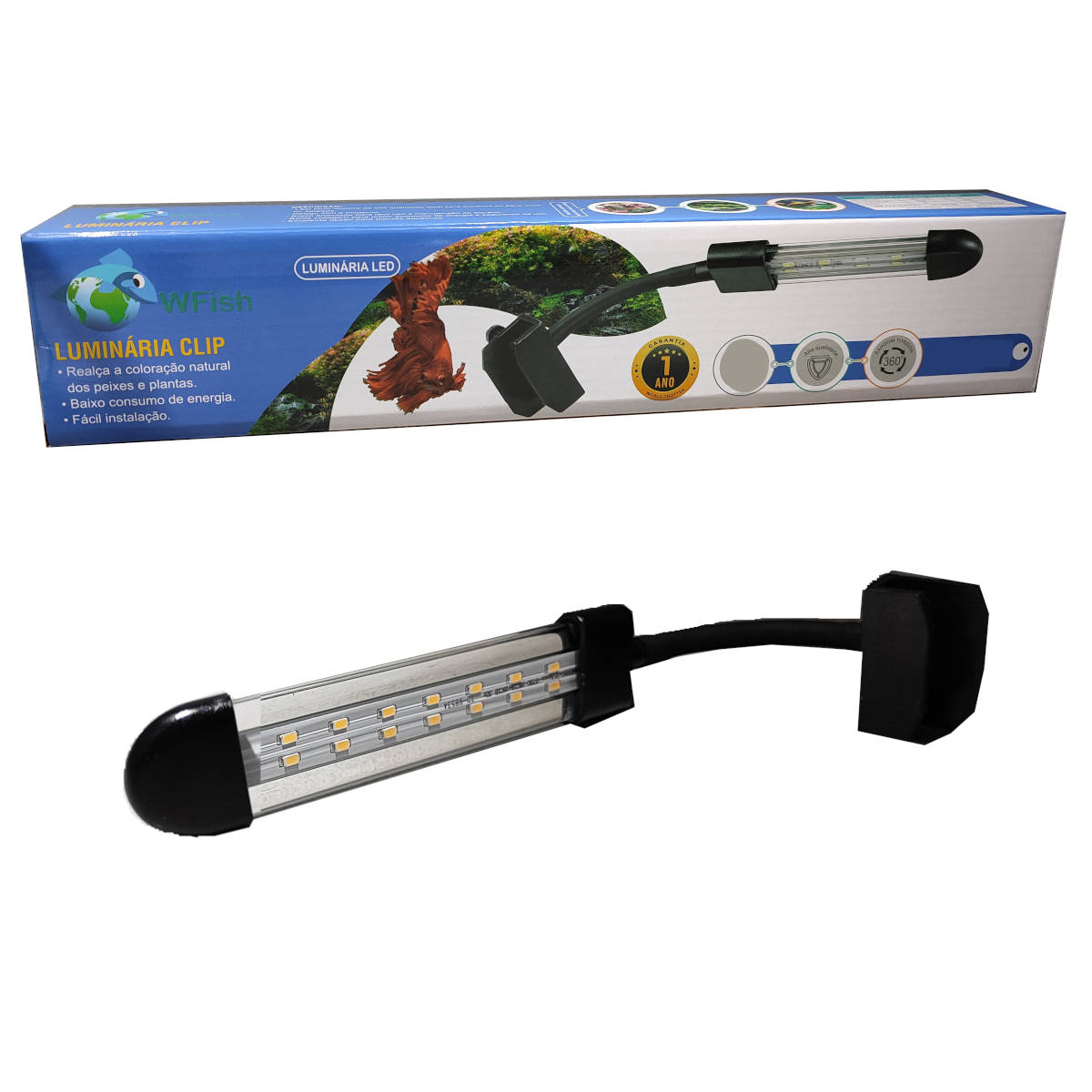 Luminária LED Clip para aquários de água doce ou salgada de 30 a 35cm. O equipamento fornece uma iluminação composta por 8 LEDs brancos e uma elegante borda cristal, que além de reforçar as cores do aquário, dão um toque especial ao conjunto.