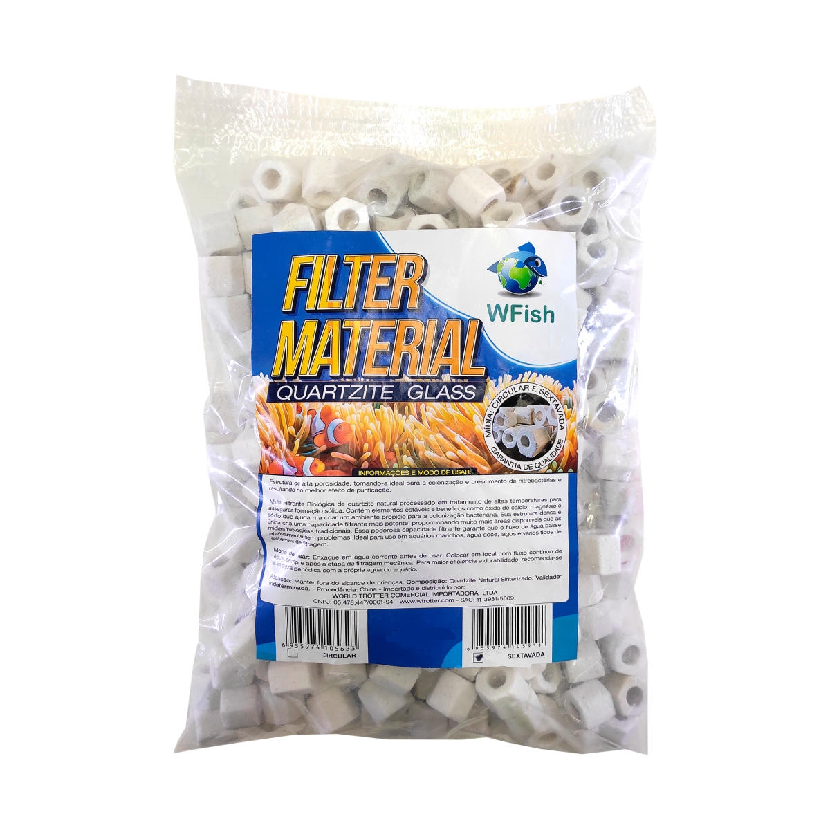 Mídia biológica em forma de anéis hexagonais com 1,6x1,6cm de quartzito natural processado em tratamento de altas temperaturas, para assegurar formação sólida. Contém elementos estáveis e benéficos como óxido de cálcio, magnésio, potássio e sódio que ajudam a criar um ambiente ideal para a colonização bacteriana. Sua estrutura densa única cria uma habilidade infiltrante mais potente que provê muitas vezes mais área disponível que mídias biológicas tradicionais. Sua habilidade infiltrante assegura que a água passe pelo seu interior, onde estão as colônias de bactérias.